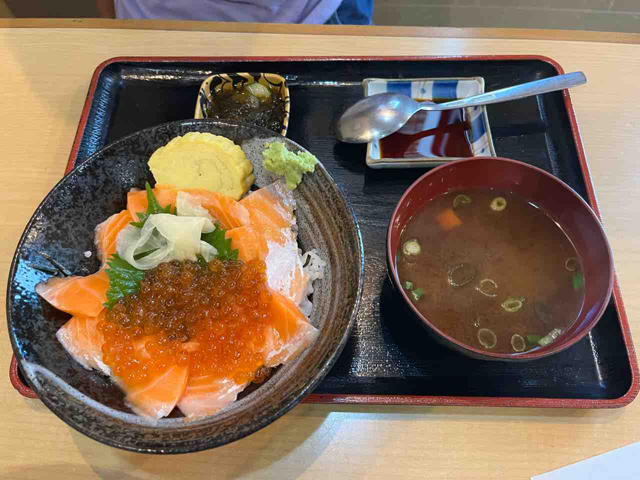 市場で朝食セットA、サーモンとイクラ丼定食@いちます(名古屋市中央卸売市場本場、愛知県名古屋市熱田区川並町)