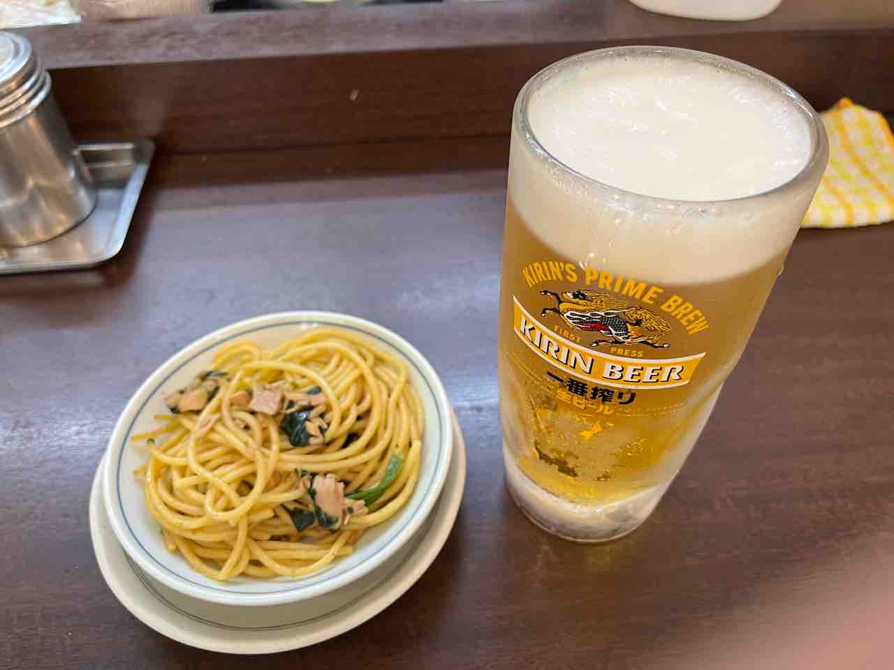 うどんはつまみにしにくいけど、野菜が多いなぁ。スパゲッティーはつまみにもなるけど、野菜が少ないなぁ。紅生姜でもついてれば文句ないんだけどなぁ〜。っと究極の選択を迫られ、ファイナルアンサーはスバゲッティーになりました。