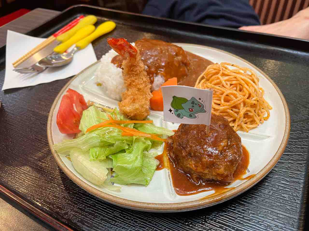 ニンジンはグラッセ、パスタもしっかりした物、ハンバーグは大人が楽しめるものだし、エビフライもおいしい。サラダにも抜かりはございません。
