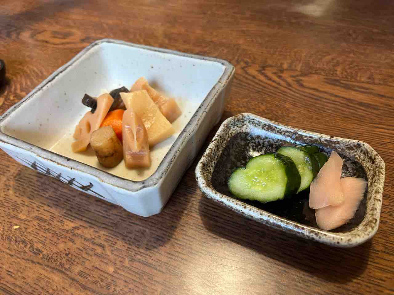筑前煮と漬物はつまみとする。