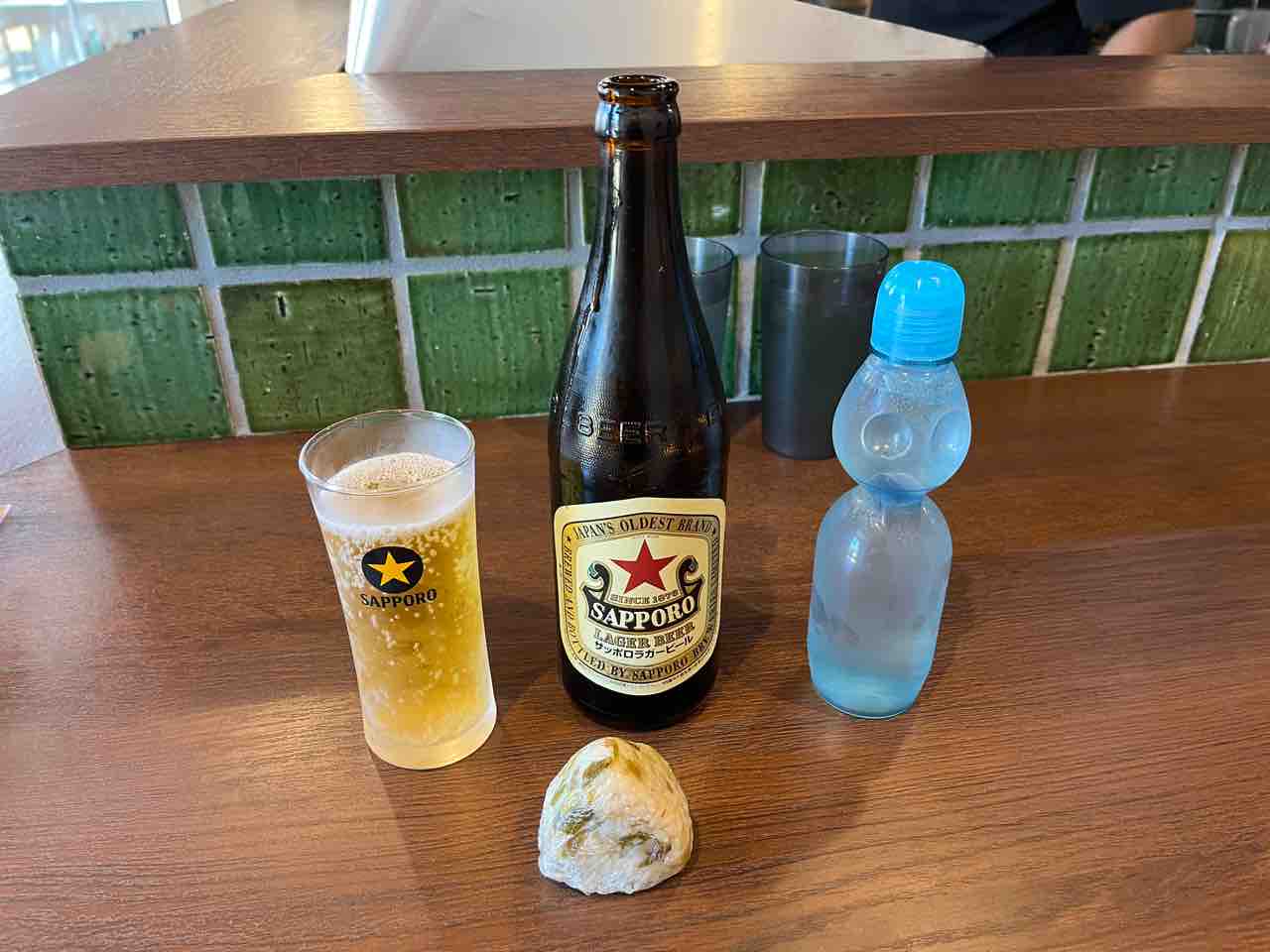 お父さんは赤星、真ん中のチョイスはラムネで乾杯いたします。