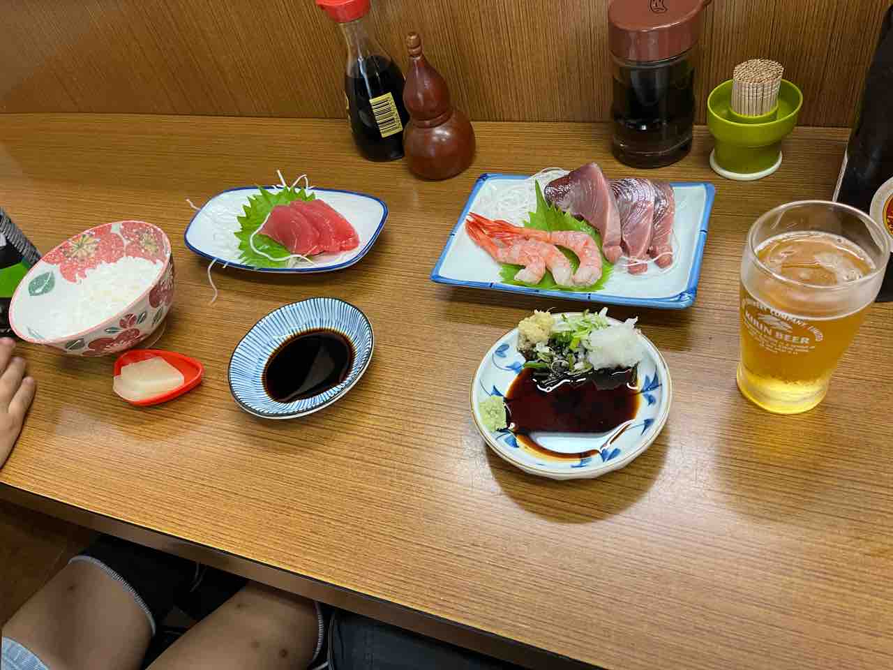 市場で鮪・鰹・甘海老刺、鰈の西京焼き、茸餡掛け豆腐@魚源食堂(柳橋中央市場、愛知県名古屋市中村区名駅)