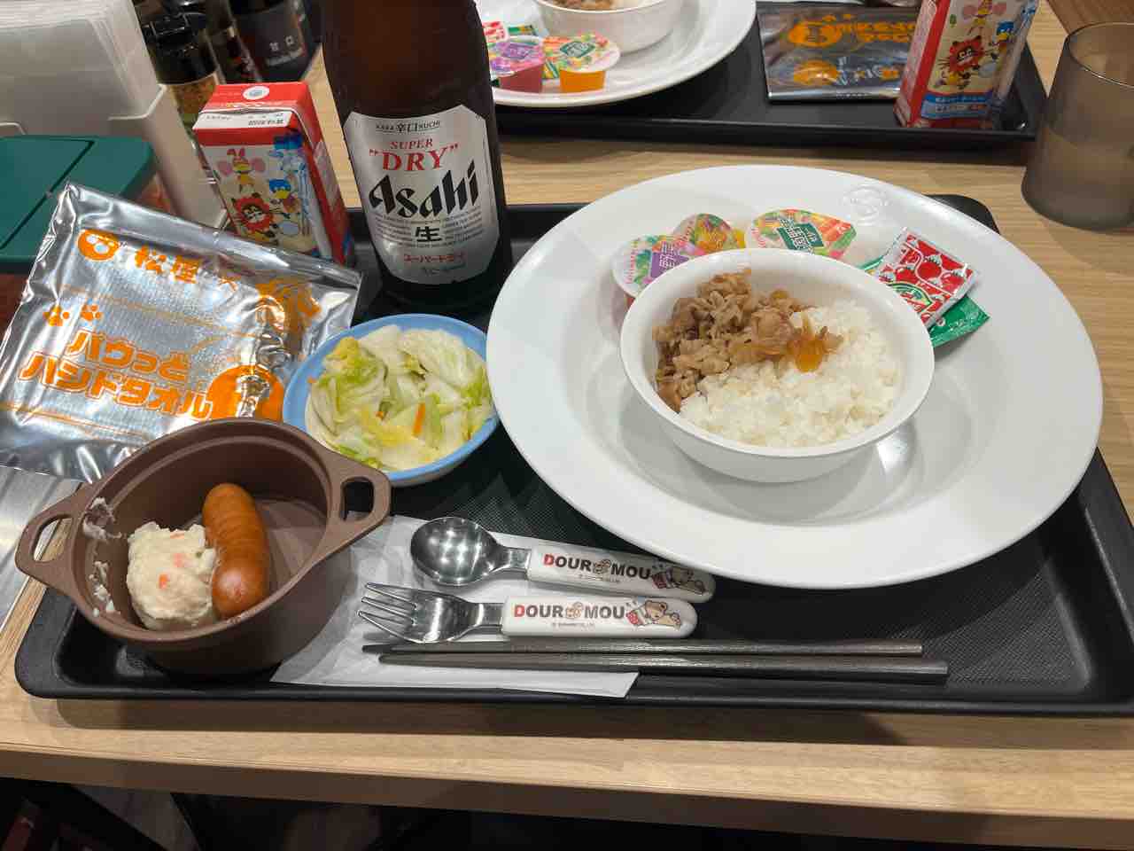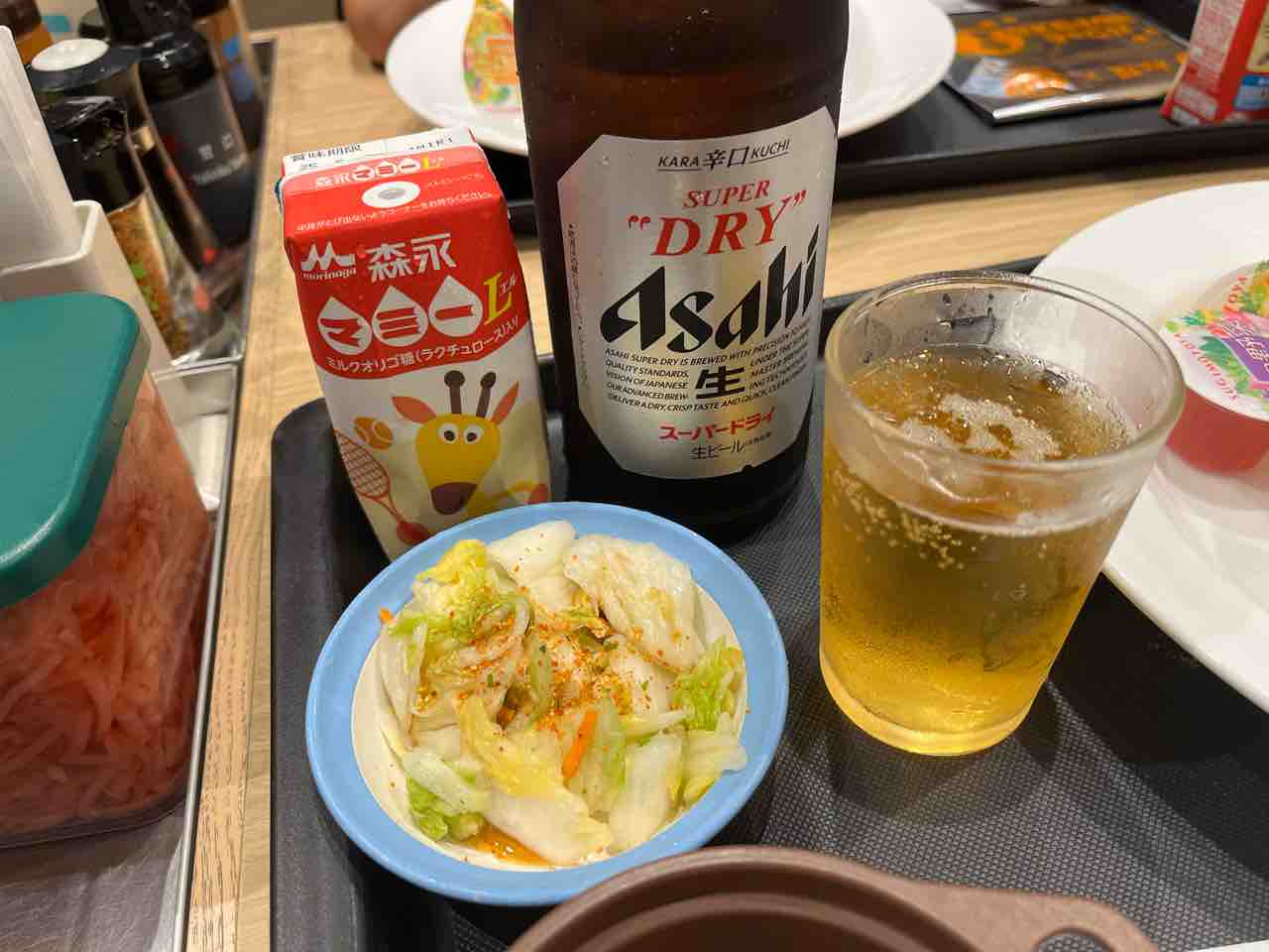 お父さんはおこさま牛めしわくわくセットにビールとお新香をつけていただいております…。