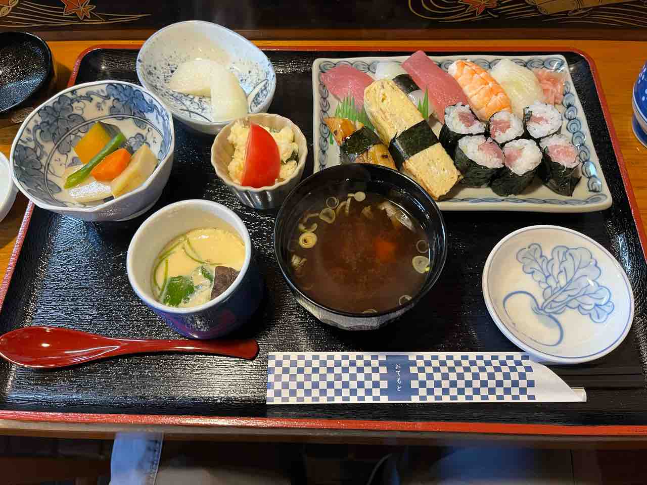 鮨は、鮪✕2、烏賊、海老、白身、玉子、穴子、鉄火巻。小鉢✕2、茶碗蒸しに味噌汁、水菓子。