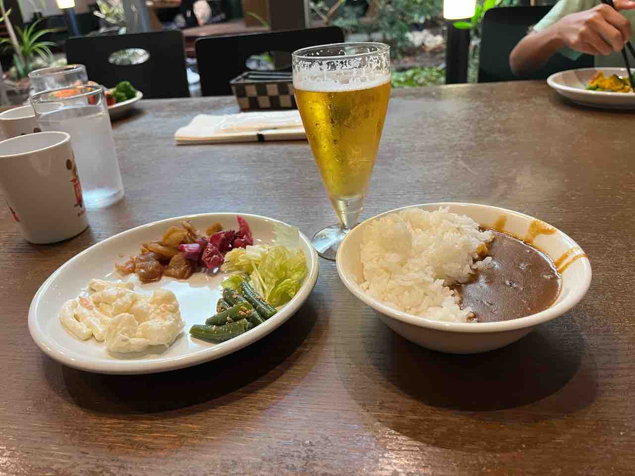 サラダバーから座敷に戻りまして、コーンスープで胃を温めてから、ランチビールをいただきます。