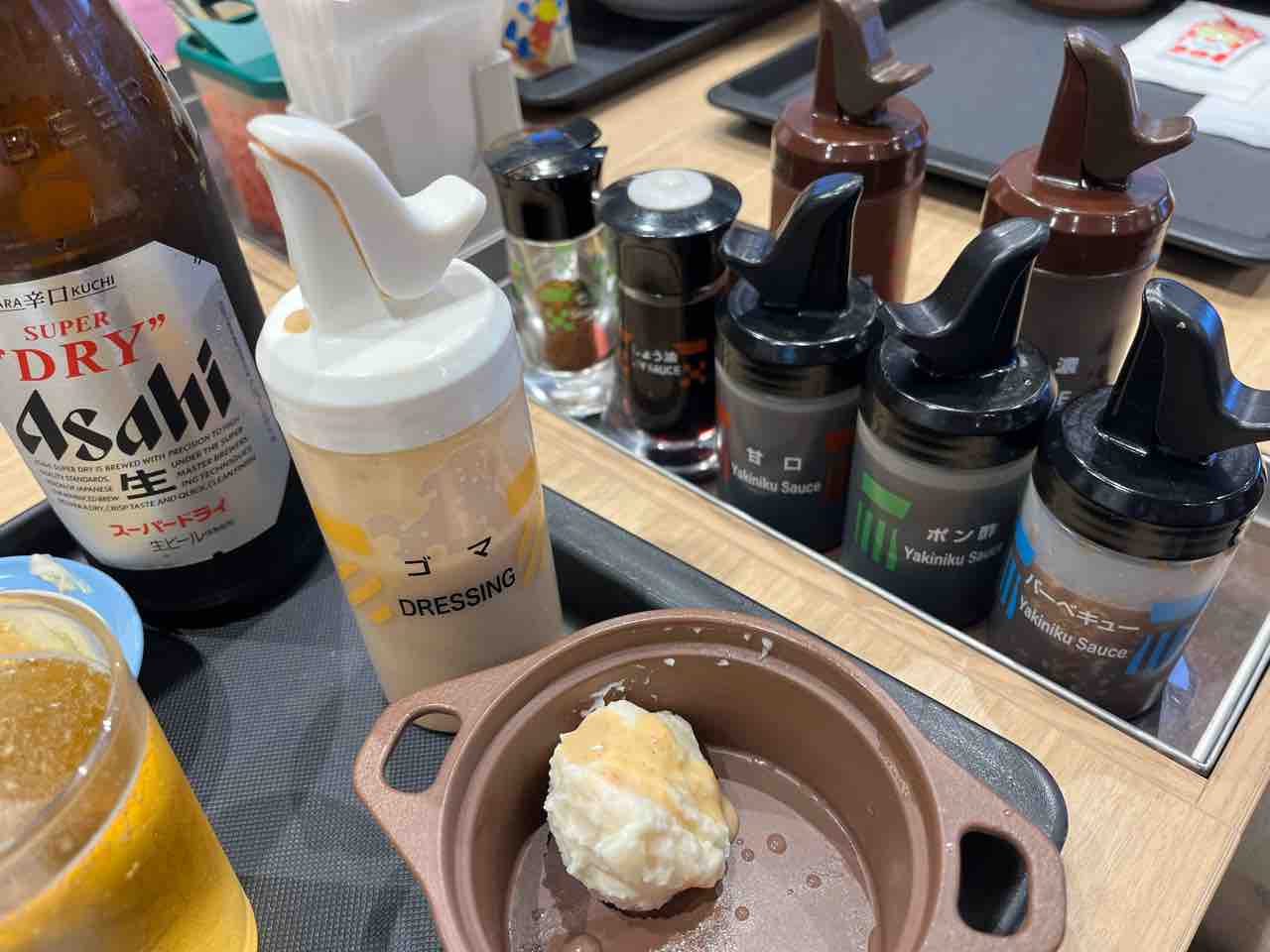 子どもが残したポテトサラダにゴマドレッシングなどかけて、さらにつまみのグレードを上げていただきます。