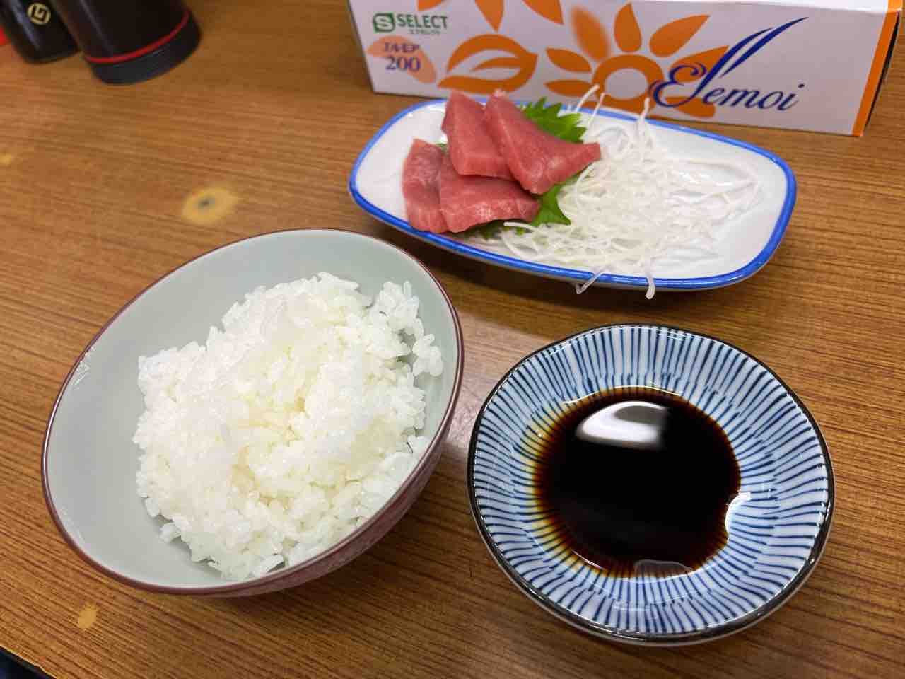 本日の刺身は「鮪にカツオ」、隣の方は烏賊を食べておりましたが、どうやら烏賊はヤマ(市場で完売の意)らしく、お姉さんの口から烏賊ってワードは出てきませんでした。