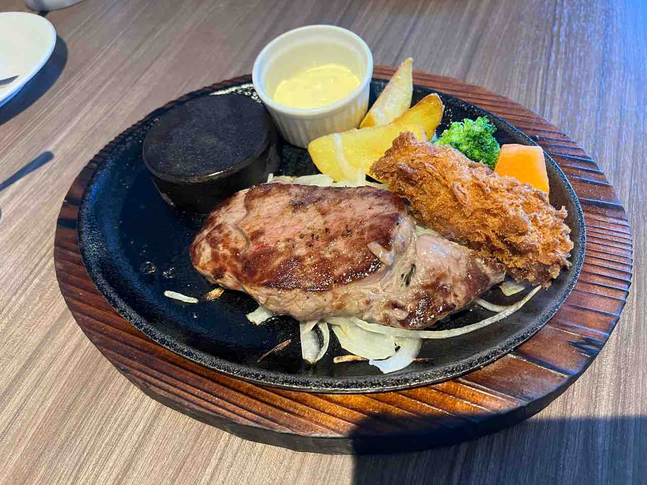 アタクシはランチ赤身ステーキにカキフライをつけていただきました。