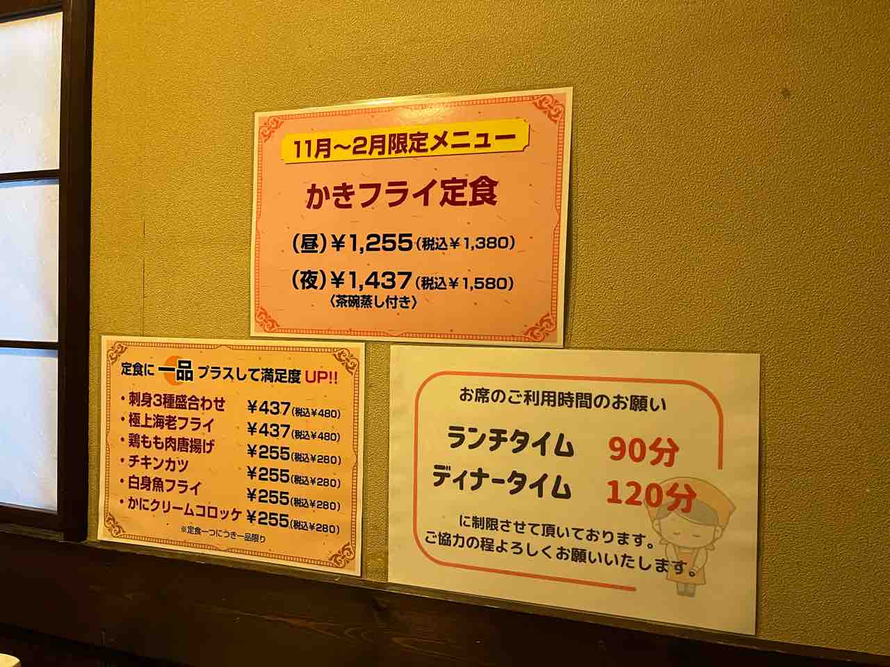 壁掛けメニューに「かきフライ定食」を見つけ一安心。
