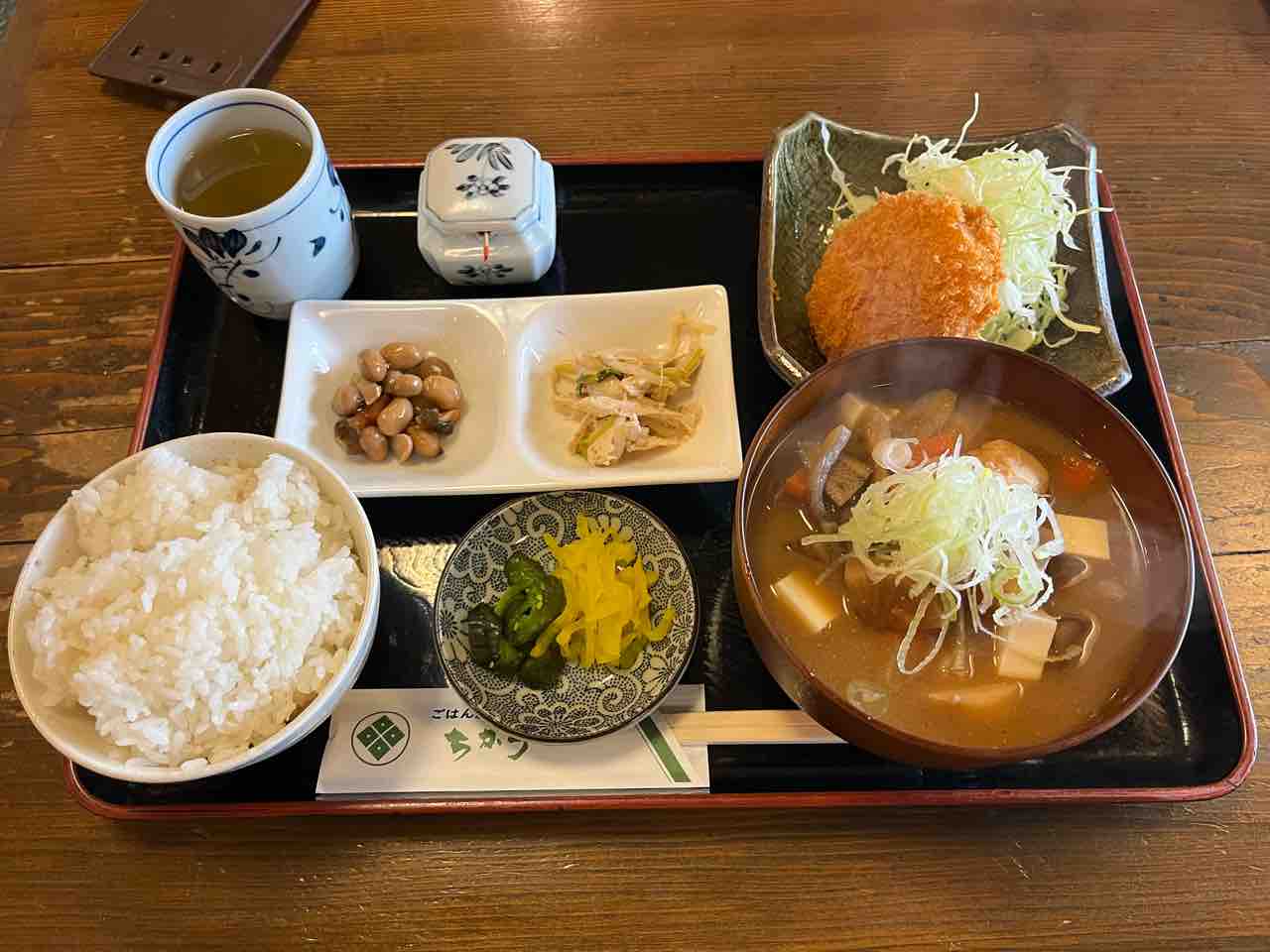 先客がカレーライスを食べていたら、間違いなくカレーを頼んでしまったんでしょうが、本日は初心貫徹で座る前から「豚汁定食お願いします!」っとお姉さんに声をかける。じゃ〜ん!これがごはん屋ちからの豚汁定食だ!!