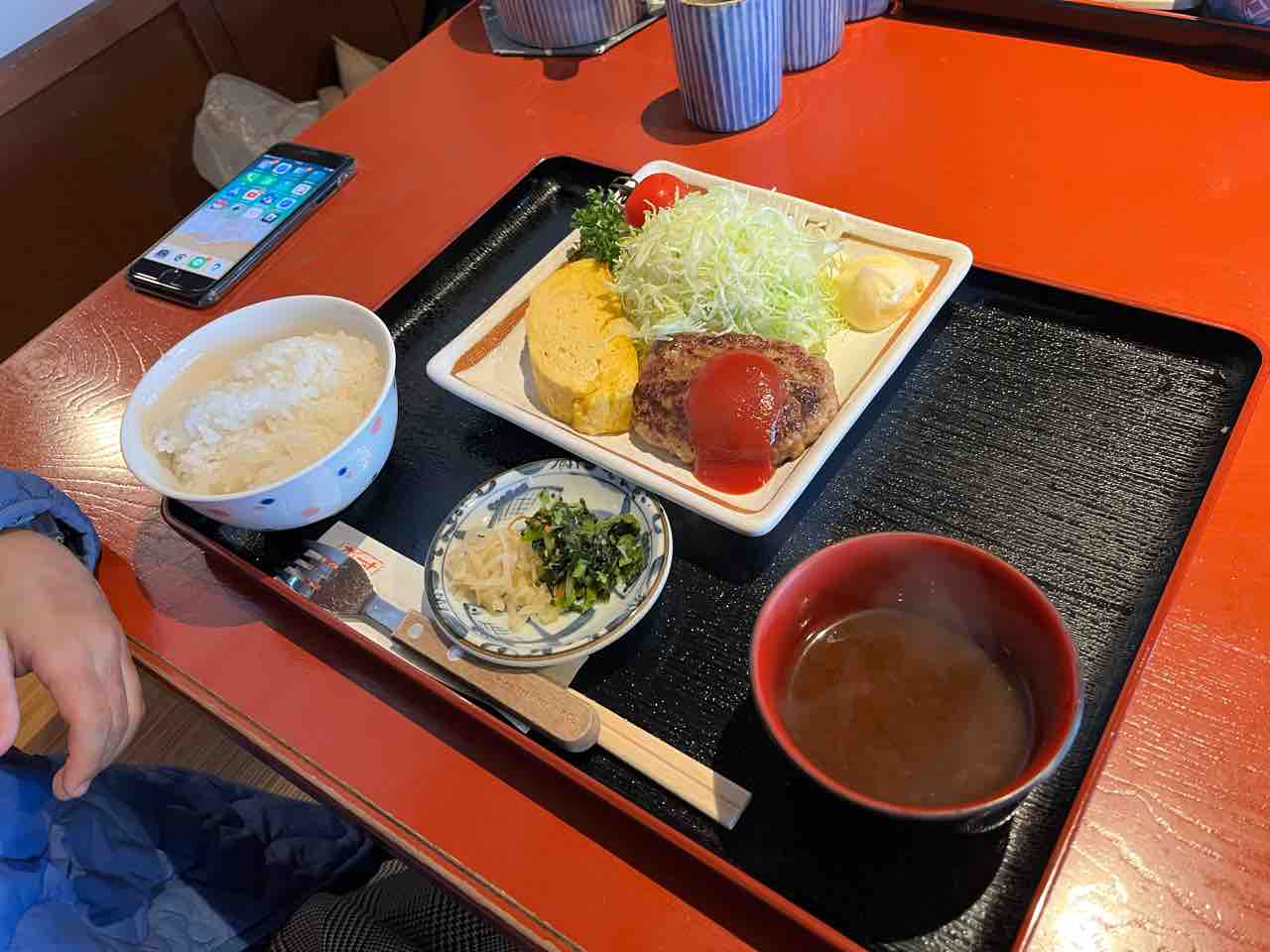 ハンバーグにだし巻き、ごはんに赤だし、漬物が付いております。