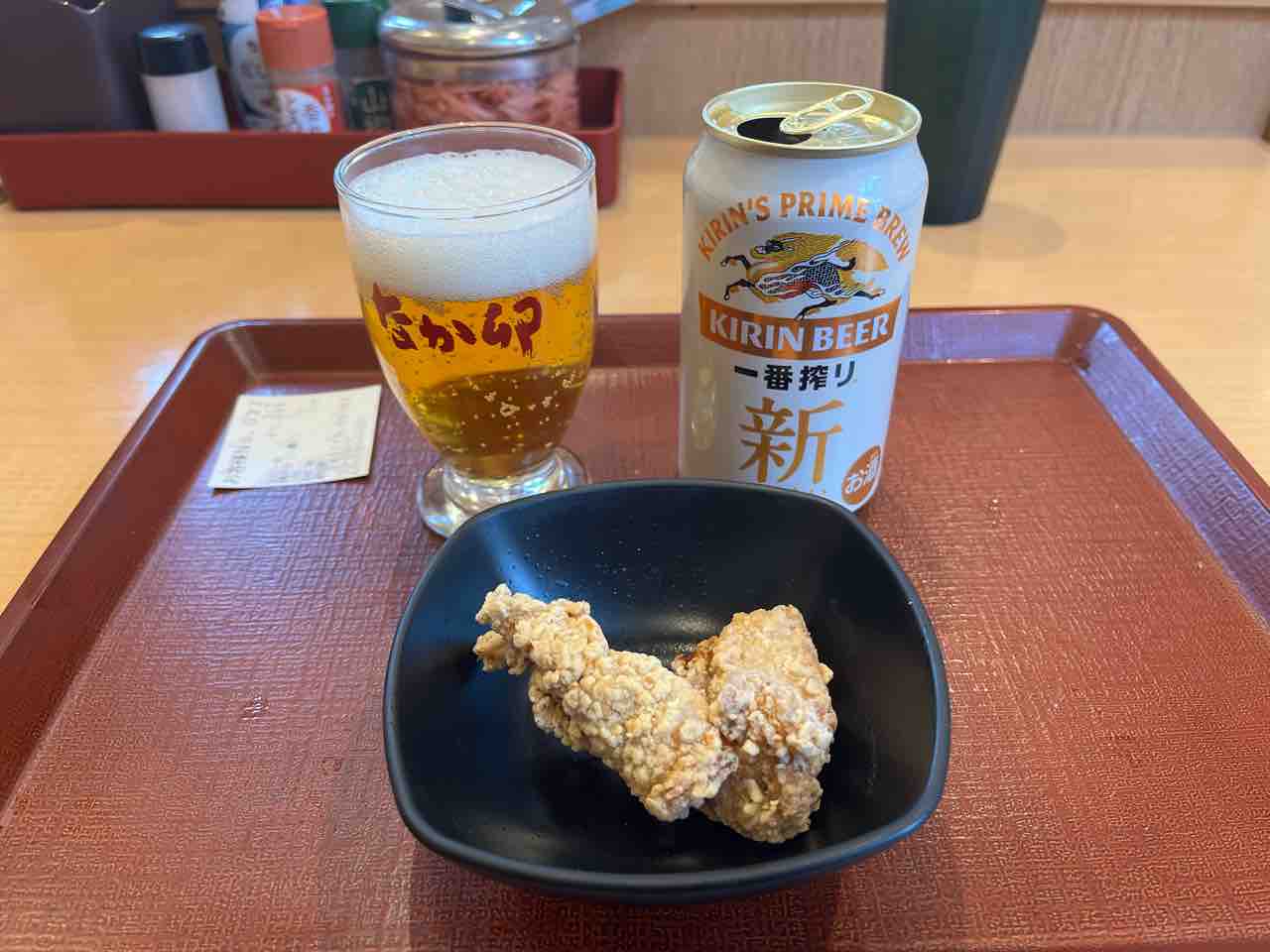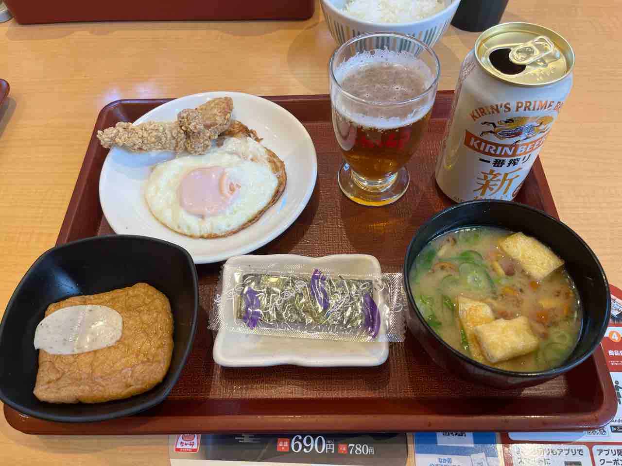 缶ビール&鳥から1個、目玉焼き朝食(ごはん小盛、味噌汁小うどん変更)、京風つけもの、お子様きつねうどん うき卯きセット@なか卯202410