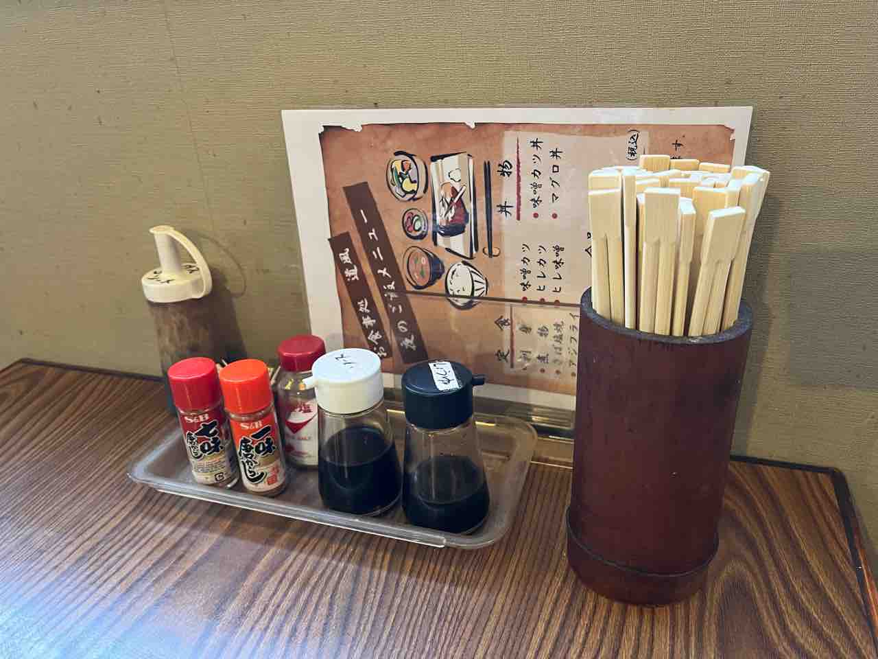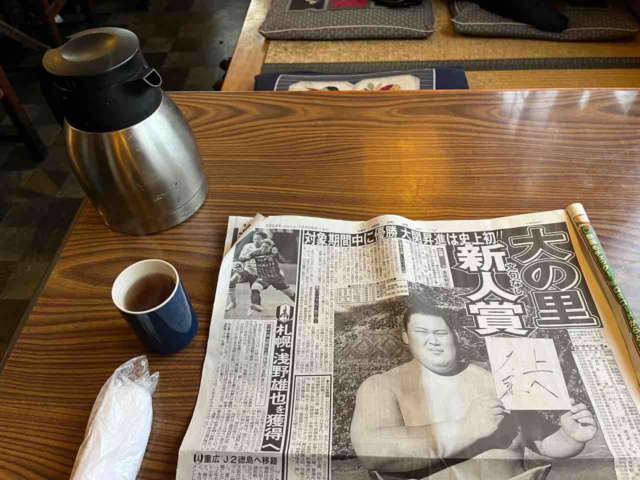 スポーツ新聞を確保して、亭主に促されテーブル席に着くとお茶とおしぼりが提供されます。