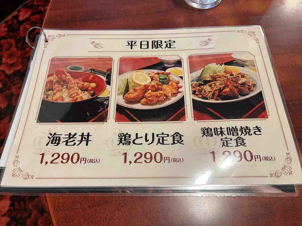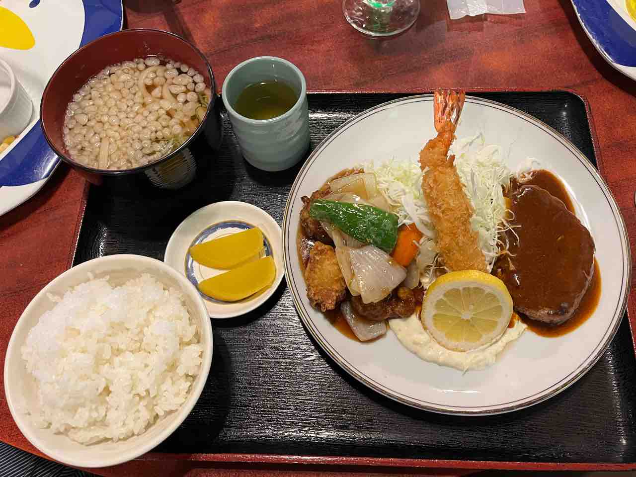 松葉定食は酢鶏、エビフライ、ハンバーグのラインナップ。