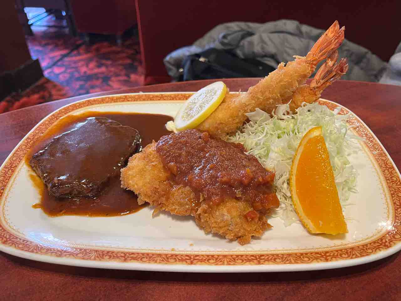 ステーキにチキンカツ。エビフライ2本の豪華版。
