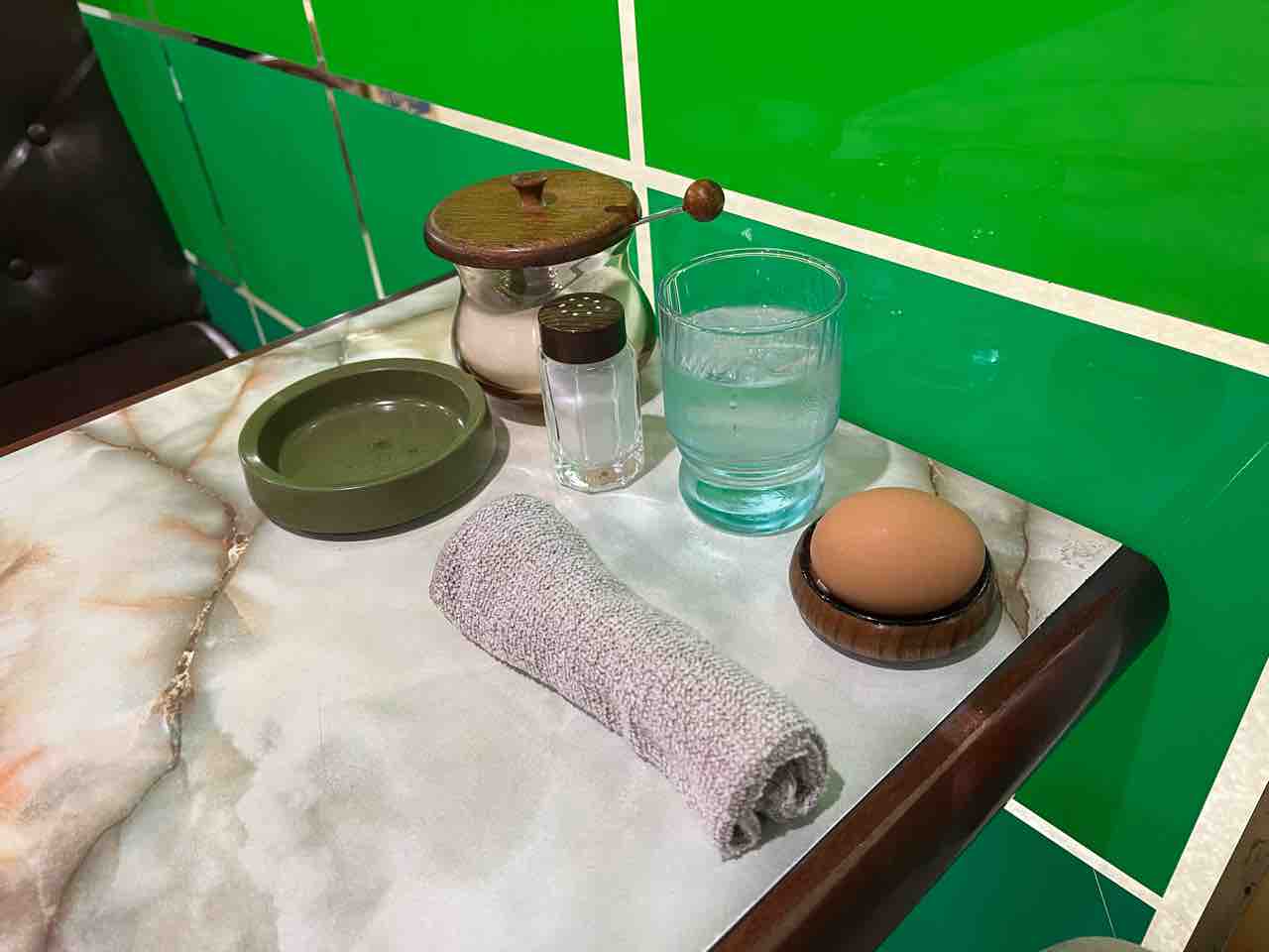 座れば出てくるお水におしぼり、そしてゆで卵。