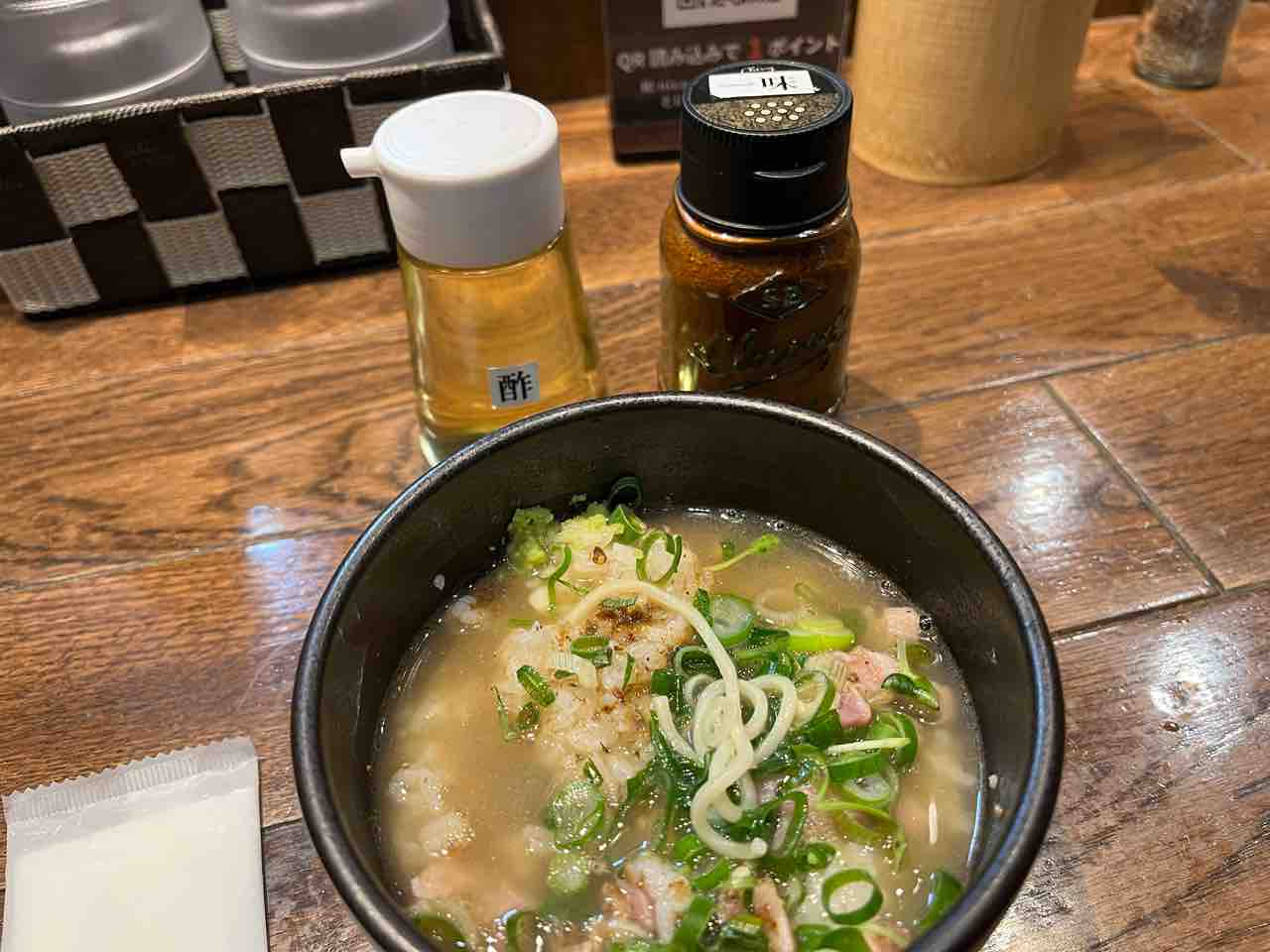 朝酒のシメはおかか飯にラーメンスープをかけズルズルっとすする。