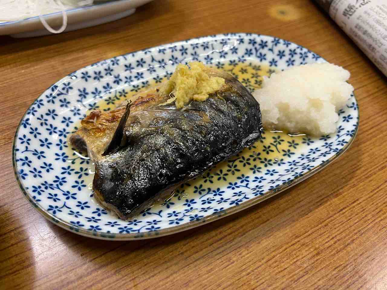 子供がご飯と格闘しているもので、鯖の塩焼きを追加。