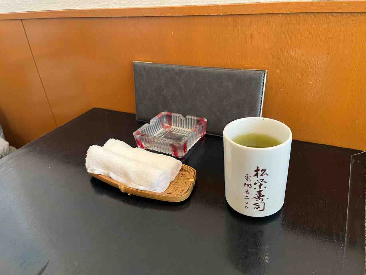 屋号が入ったデカイ湯呑みにおしぼりが提供されます。