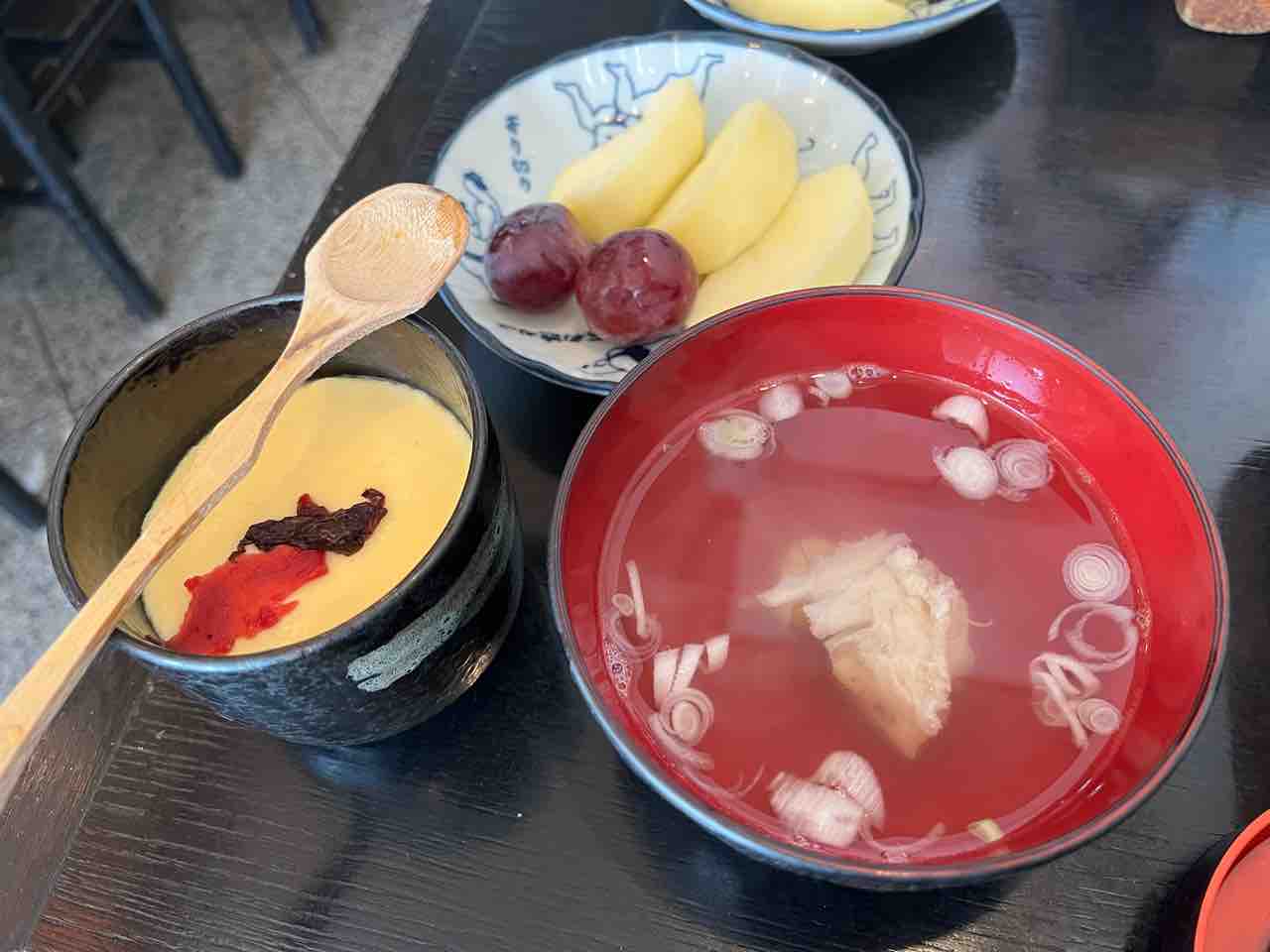 こちらは茶碗蒸しにお吸い物、フルーツが付いてきました。