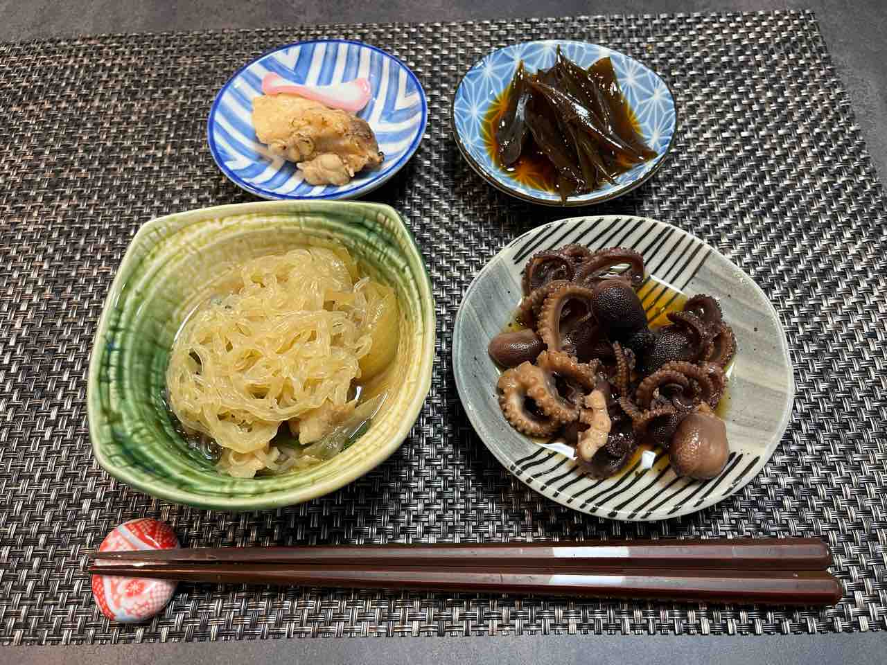 飯蛸は旨いし、糸蒟も旨い!茎若布の佃煮でご飯を一膳いただいて明日からのハードワークに耐えたいと思います。