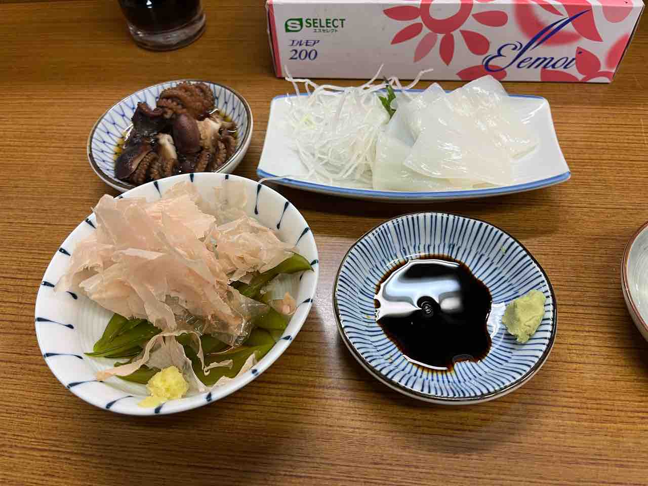 本日は「白いのは鮃と烏賊」ってことで烏賊をお願いした。カウンターに並ぶお惣菜から飯蛸をチョイス!茎若布は三杯酢でお願いして、こんな感じの朝酒の始まり。