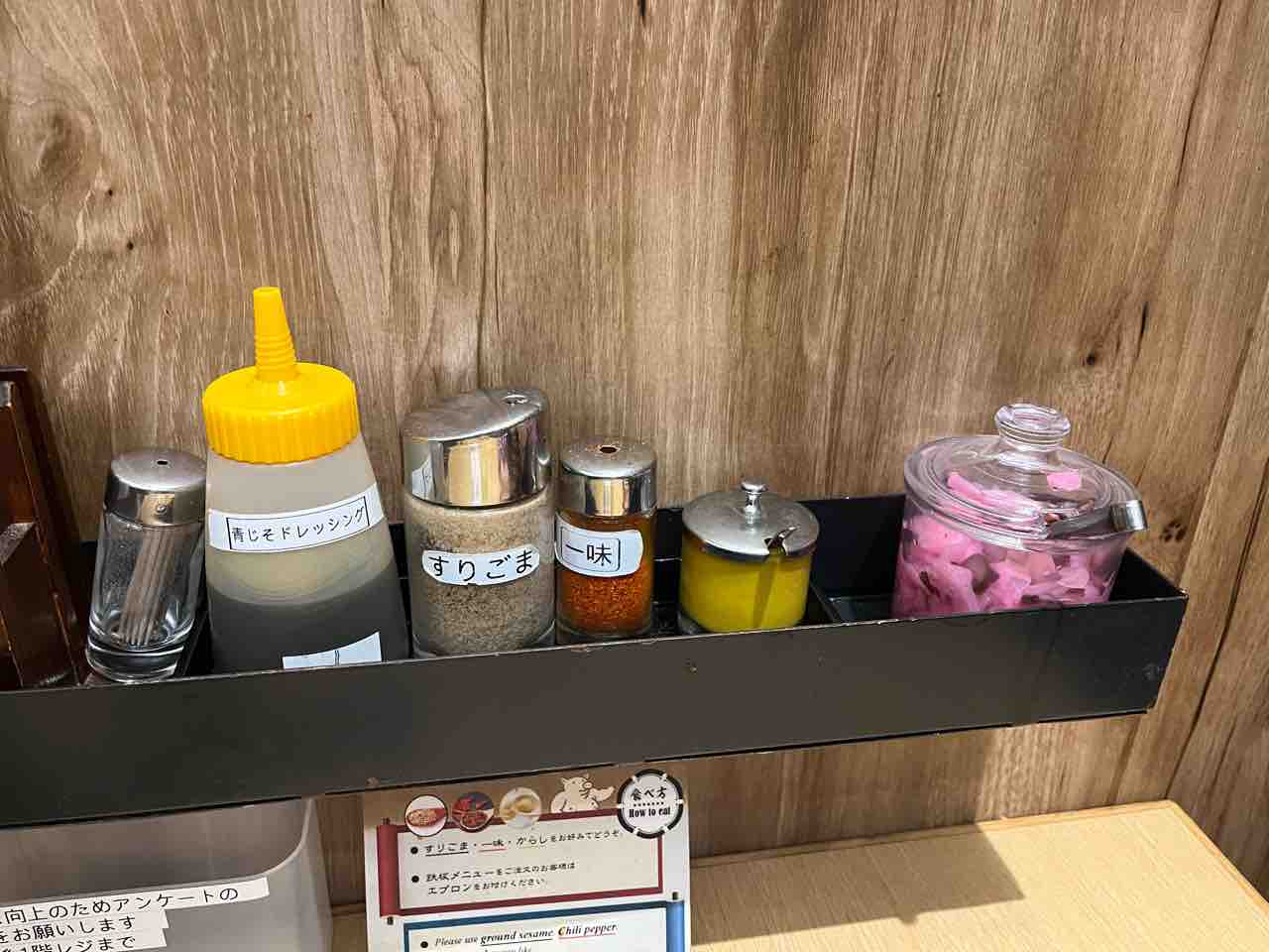 机上にはこんな調味料のラインナップ。テイクフリーの漬物は桜漬け。
