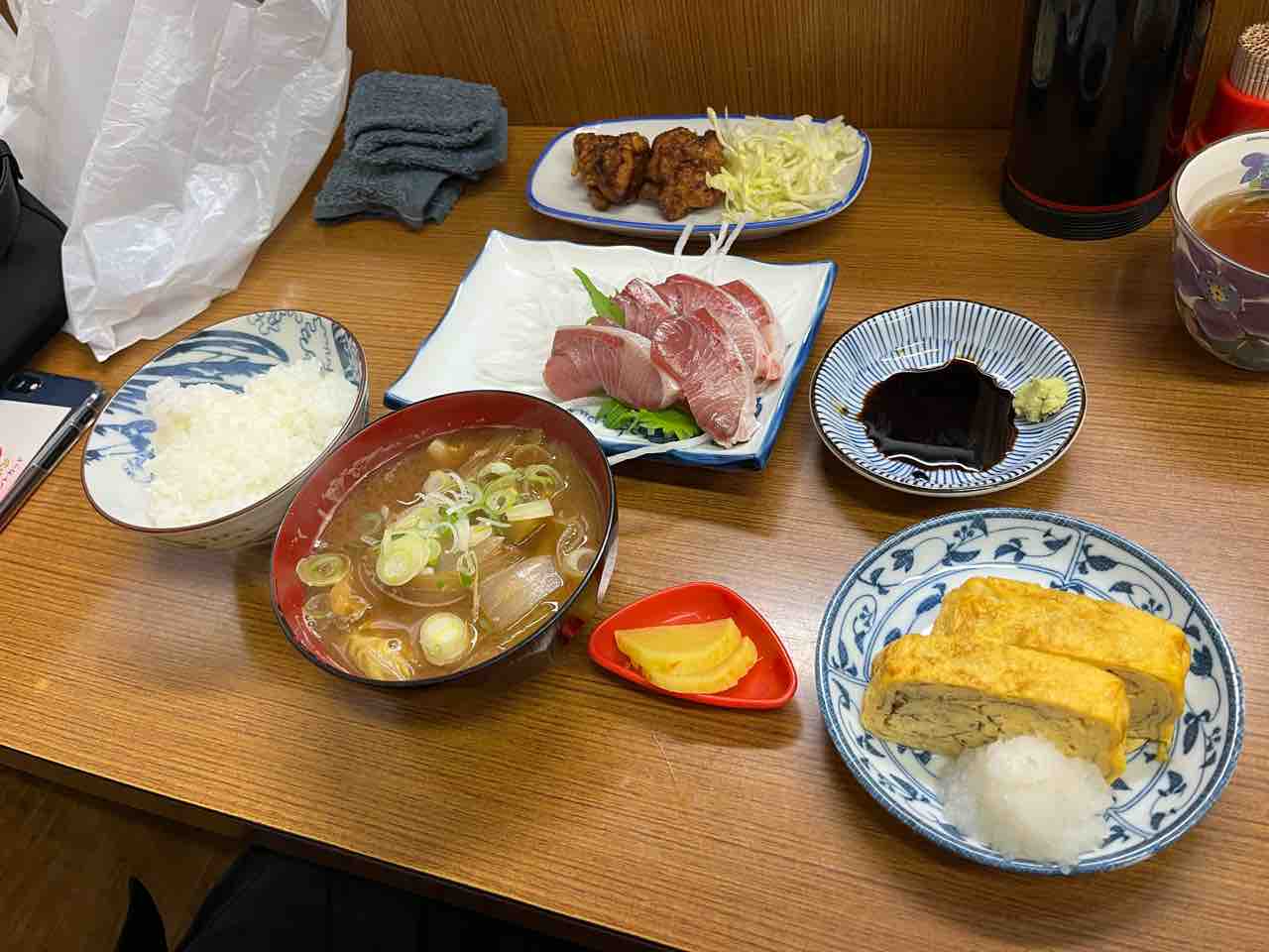 市場で鮪・鰤刺、唐揚げ、出汁巻き、蛍烏賊の沖漬け、鰯の塩焼き@魚源食堂20250315(柳橋中央市場、愛知県名古屋市中村区名駅)
