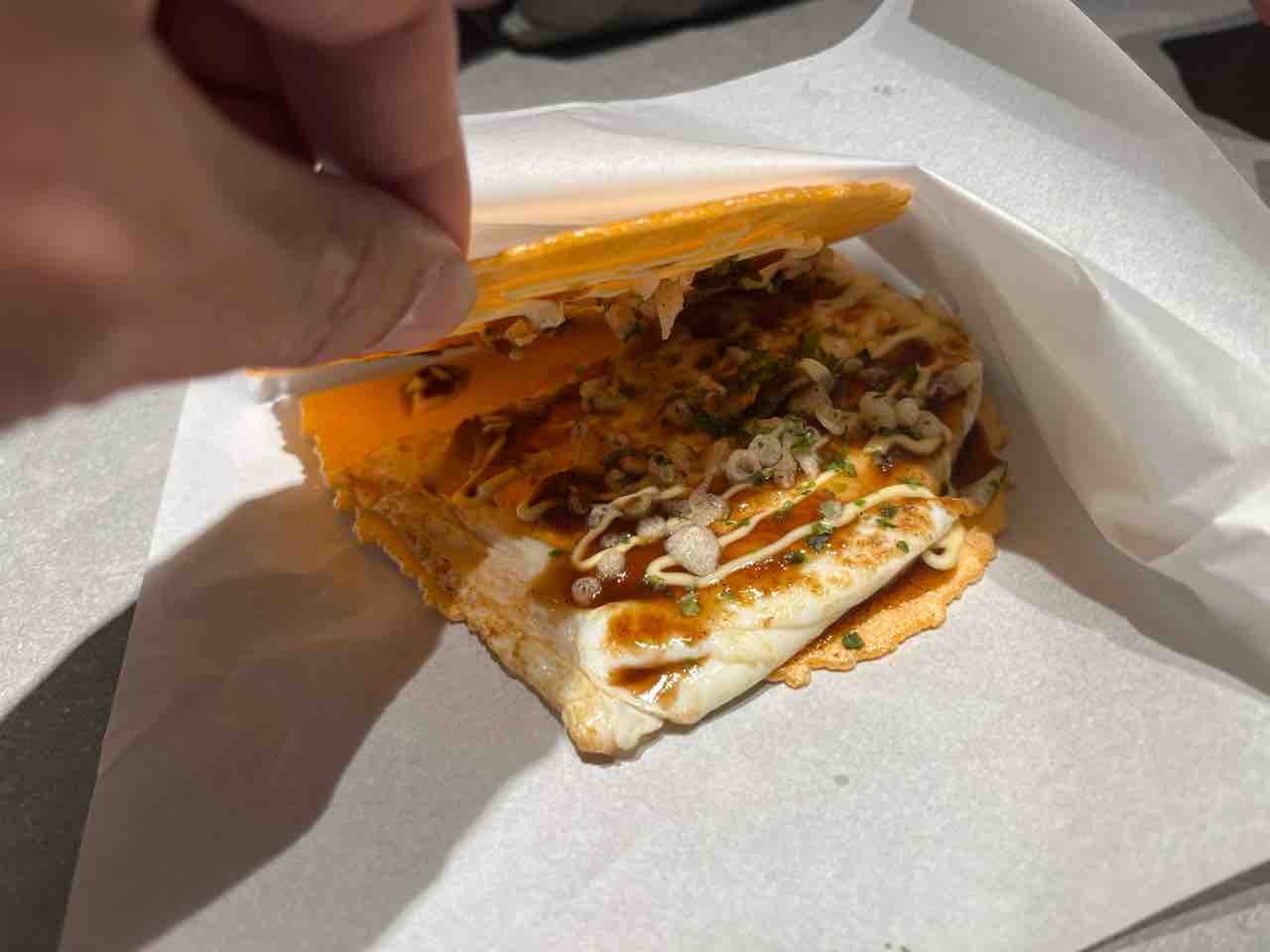 えびせんべい(またはたこせんべい)に目玉焼きや卵焼きを挟み、お好み焼きソースやマヨネーズで味付けしたものです。