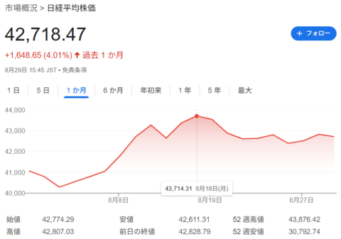 8月12日、日経平均株価は約1年ぶりに史上最高値を更新。その背景には、海外短期筋とみられる先物主導の買いや、AI関連株を中心としたハイテク銘柄の好調な決算があったといわれています。さらに8月18日には上昇が続き、史上最高値 43,714円 を記録しました。この局面では「サラリーマン狩り」よりもむしろ「持たざるリスク」という言葉の方が市場関係者の口に上る8月となりました。
