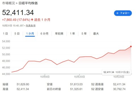 10月9日は終値で史上初48,000円台に乗せる。高市トレードって言葉が生まれましたね。