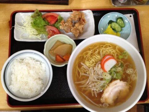 出てきてびっくり!ラーメン定食550円。ラーメン(380円)、ライス(150円)で小鉢かおしんこくらいつくかな!?まあ550円だもんなと思っていたら、から揚げまで付いてきました。以前はラーメン330円!だったので、値上がりはしていますが、ランチはこれで550円なら値上げしたとは言えないでしょう。