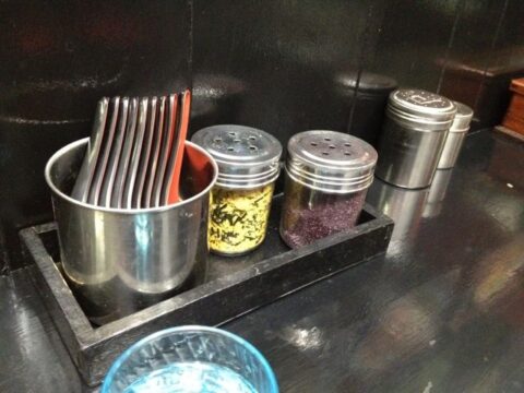 店の中もカウンターのみ。カウンターの上には七味に故障、さらにふりかけもある。
