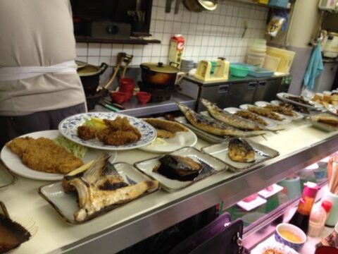 店に入るというか暖簾をくぐると、料理が並ぶカウンター。