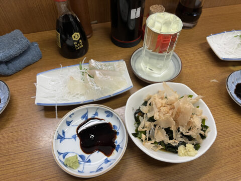 新わかめ(本日の大金星!) 「もう新わかめあるの!?」と驚きつつ注文。鰹節たっぷりに三杯酢をかけて頂きます。肉厚でシャキシャキとした食感、若々しい海の香りは、一口ごとに体が浄化されるよう。
