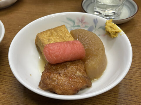 さらに、カウンターで狙っていたハンペイ(名古屋でおでんの意)も。 加賀揚げに、名古屋独特の「赤棒」、厚揚げ、大根。出汁の染みた大根は言わずもがなですが、赤棒を齧ると「あぁ、名古屋の市場で飯を食っている」という幸せが込み上げます。