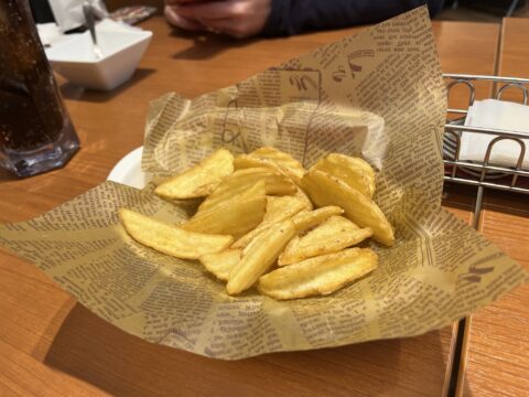 ポテトをV字、波状に切って揚げてあるんですが、表面サクサク、中身ホクホク。ポテトチップスとポテトフライのいいとこ取り!って感じでして、子供が食べる食べる!
