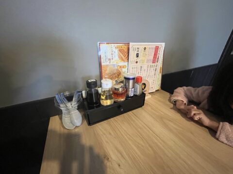 机上の調味料のラインナップは餃子屋さんのそれですね。