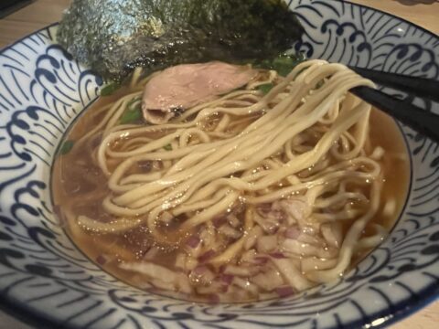 ラーメンに造詣が浅い私の感想ですが、麺は独特な中太麺で、この旨みたっぷりのスープをよく纏います。炒められた玉ねぎはスープに自然な甘みを加えています。