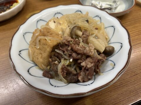 厚揚げ、イトコン、しめじに牛肉が甘辛く煮付けられておりまして、いいつまみになりますな!