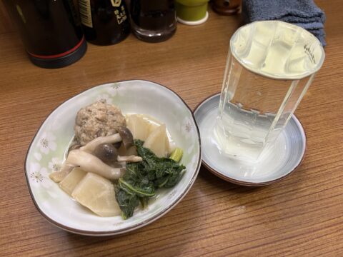 鶏肉の団子にしめじ、お待ちかねの蕪の葉っぱも一つ一つ味わい、熱燗で飲み下す。