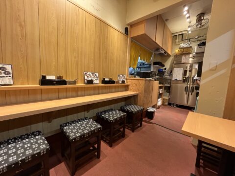 表の立ち食いスペースに加え、店内には木を基調とした昔ながらのうどん屋のような雰囲気。カウンター席とテーブル席があり、忙しい方にも、ゆっくり食事を頂きたい方にも使い勝手が良さそうですね。