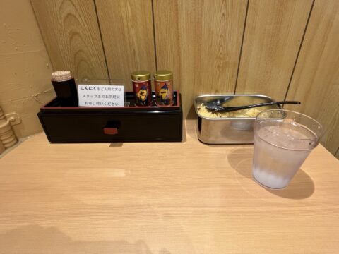 卓上には一味、七味、揚げ玉が用意され、「にんにくを入用の方はスタッフにお申し付けください」とのこと。