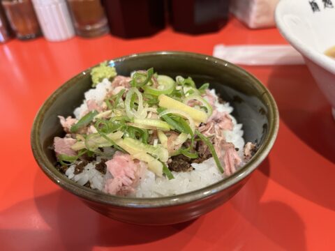 呼称は「おかか飯」ですが、おかかをふりかけたご飯の上に、レアチャーシュー、刻みネギ、茗荷、かいわれ、刻み生姜などが贅沢に盛られています。山葵まで添えられており、これぞまさに名古屋式朝ラーを体現する一品です。