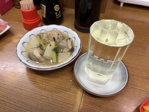 私はカウンターを眺め、今日のつまみに「かぶらの煮物(鶏団子つき)」をチョイス。 最近は家で食べる機会が減った蕪ですが、出汁が染みたそれは、しみじみと旨い。これぞ冬の贅沢、最高の日本酒のパートナーです。