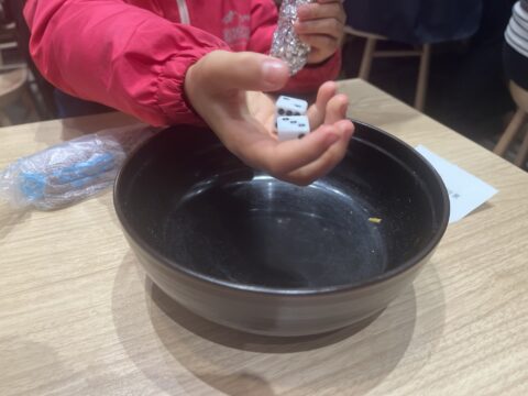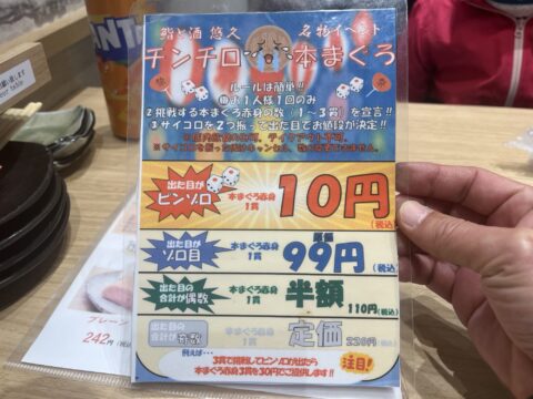 まず子供たちが挑戦したのは、名物の「チンチロ本まぐろ」。 1貫から3貫まで宣言し、2つのサイコロを振って出た目によって値段が決まるという遊び心満載のメニューです。