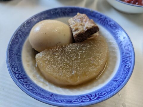 締めには大根の煮物。 本日は豚バラと玉子のコンビです。ハンペイ(おでん)の時とはまた違う、力強い味わい。大根という食材は、豚バラを相手にしても主役を食ってしまうほどの、不思議で偉大なバイプレイヤーですね。