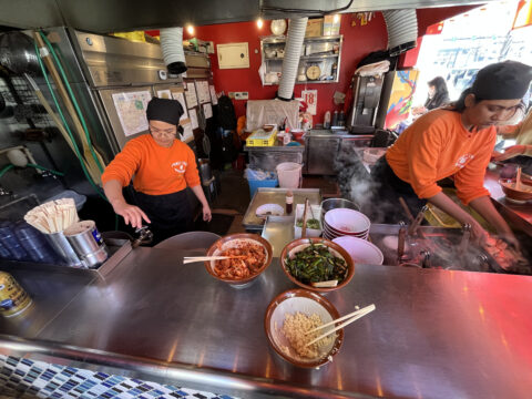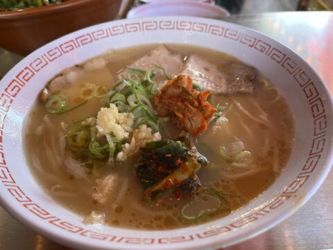 食券を買ったらキムチ・ニラ・にんにくのどんぶりの近くに居場所を押さえ、カウンターに食券を置く。