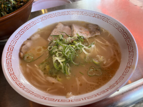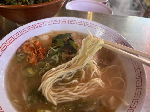 ベースはクセのない豚骨醤油スープ。細めのストレート麺がスルスルと喉を通る…、はずなのですが…。