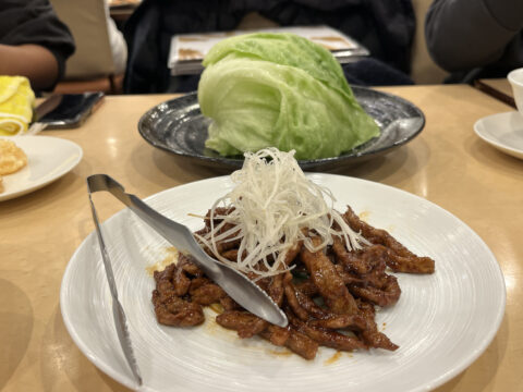 神戸の民生食堂(HP)が有名な、このスタイル。蓬莱本館は細切りの牛肉で、歯ごたえがいいですね。関西ではポピュラーな食べ方なのでしょうか? それともルーツは神戸の中華街だからこそなんですかね!?